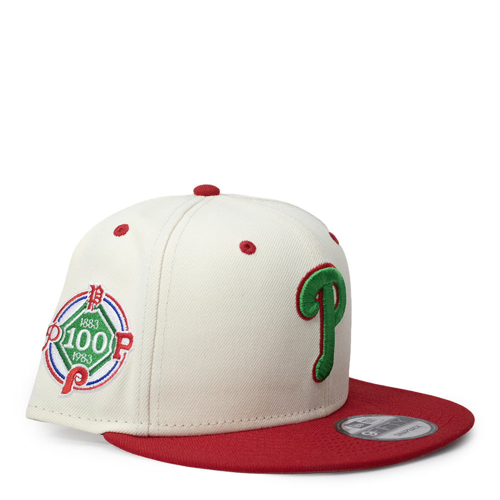 A structured Philadelphia Phillies baseball cap featuring a cream crown and a contrasting red flat brim. The front panel displays an embroidered green “P” outlined in red, while the side showcases a detailed commemorative patch celebrating the team’s 100-year milestone with “1883–1983” and “100” at the center in a circular design. Red embroidered eyelets and a matching red top button complement the color scheme. The cap has a flat visor and a fitted style, finished with an official sticker on the brim, giving it an authentic on-field look.