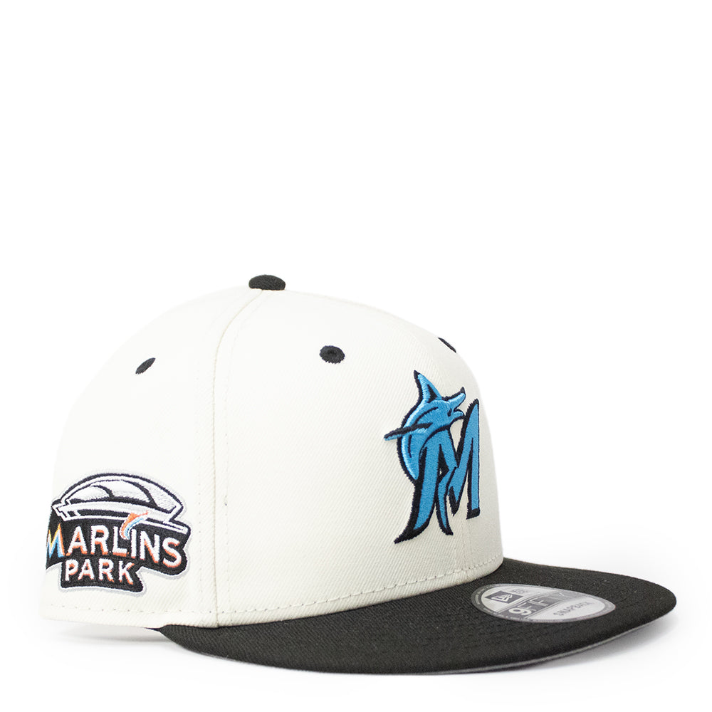 The front showcases a bold embroidered “M” logo with the signature Marlins fish detail in vibrant blue, adding a dynamic touch. The side panel features a detailed “Marlins Park” patch, paying tribute to the team’s home stadium and enhancing its collectible appeal. Built with a structured crown and flat brim, this cap offers a premium fit and contemporary style.