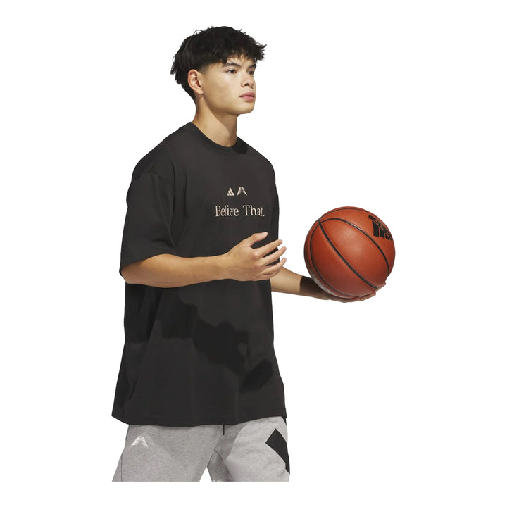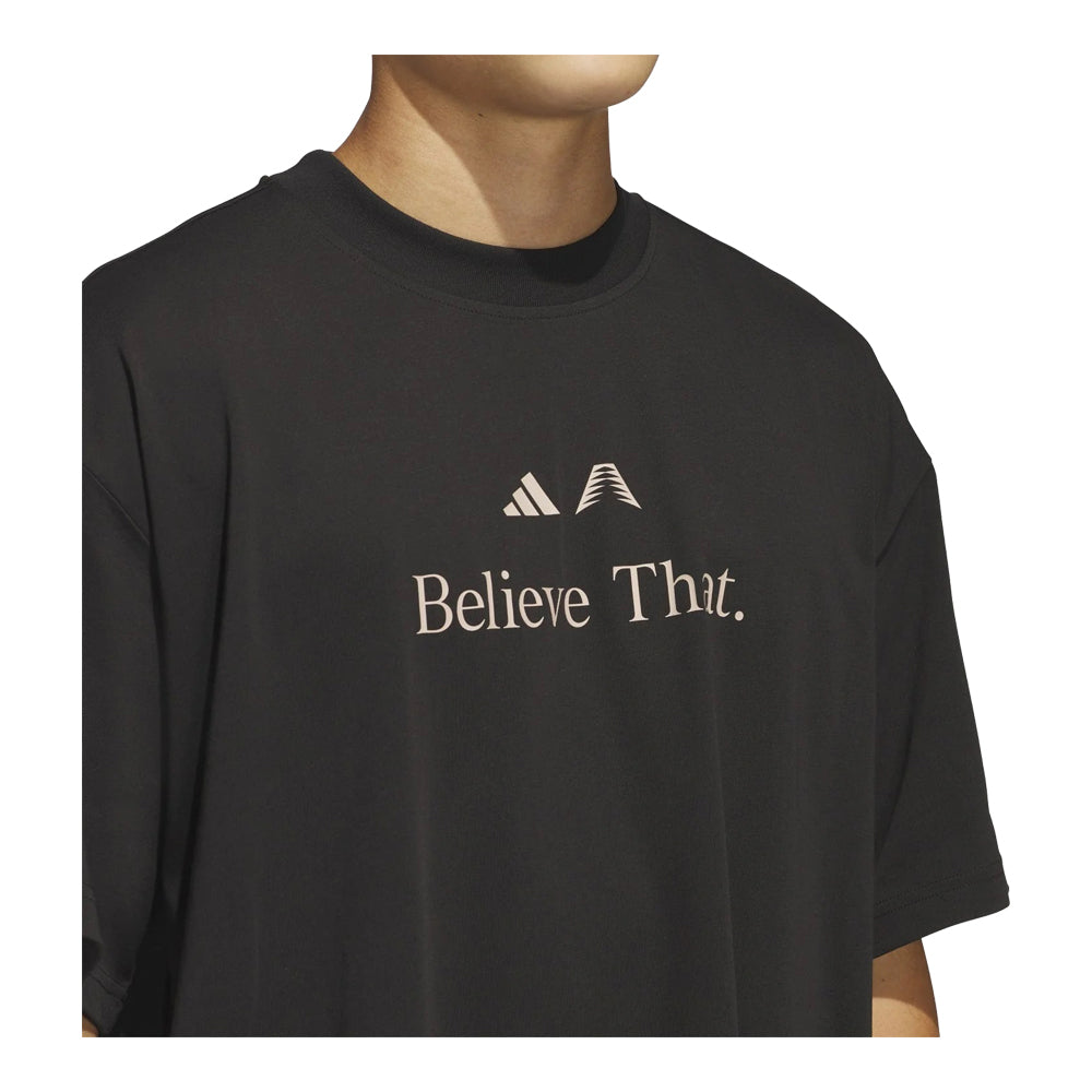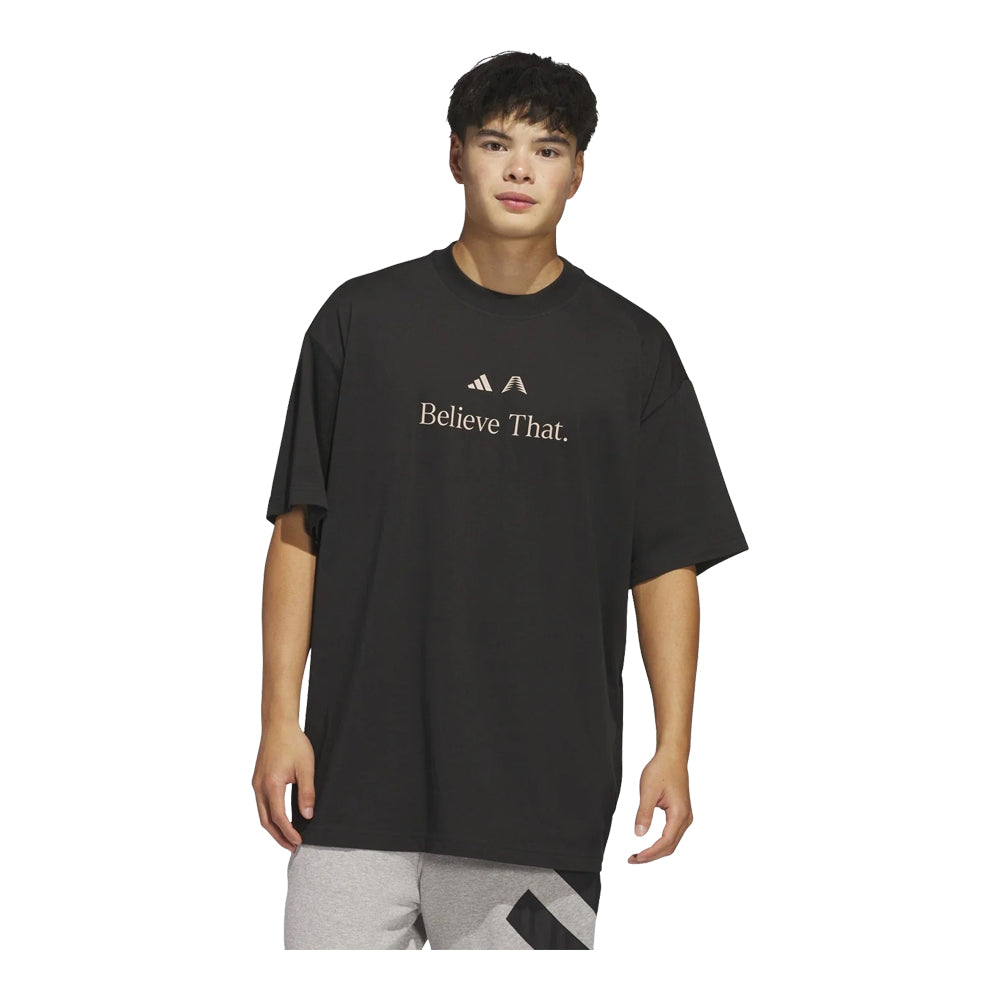 Anthony Edwards is just getting started. This t-shirt from adidas Basketball is all about what comes next. The cotton and polyester single jersey build is soft and durable, while the loose fit lets you flow effortlessly up and down the hardwood. An Anthony Edwards logo and a "Believe. That." graphic say all that needs to be said.