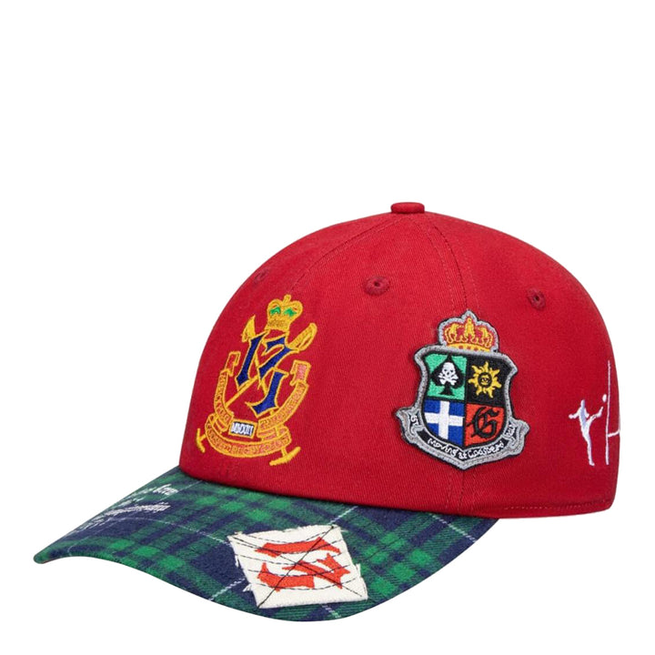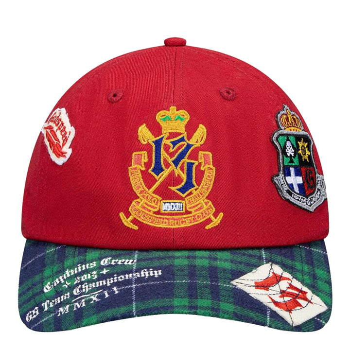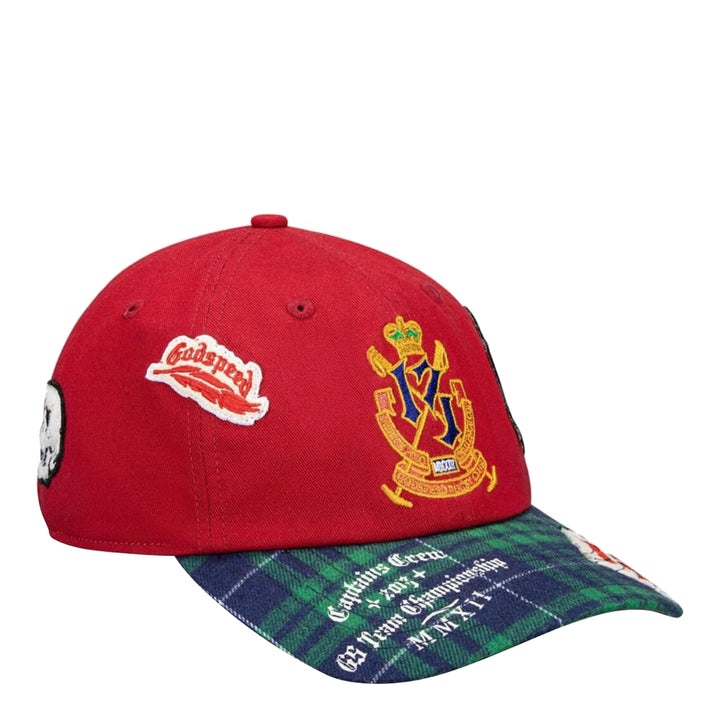 Make a bold style statement with the Rugby Captains Crew Dad Hat. This standout piece features a rich red crown, contrasted by a green-and-navy plaid brim, and is loaded with intricate embroidered patches and lettering for a premium, collegiate-inspired look.