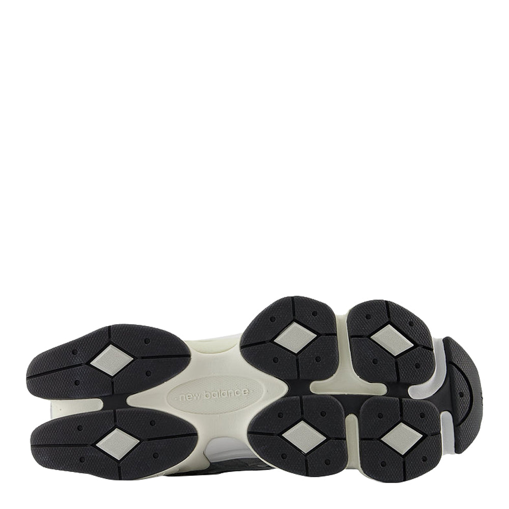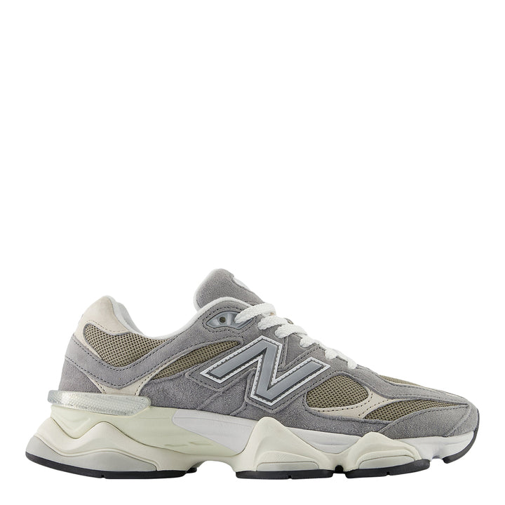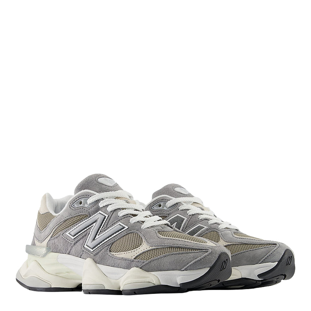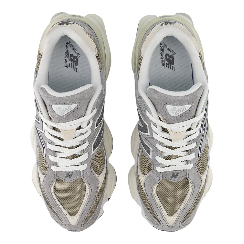 The New Balance 9060 'Slate Grey Timberwolf' showcases varying shades of grey on the upper, featuring a breathable mesh base with suede overlays throughout the forefoot, heel and saddle. The latter is marked with a molded 'N' logo, while a jeweled NB 9060 badge adorns the tongue. The sneaker rides atop a dual-density ABZORB midsole with SBS cushioning in the heel.