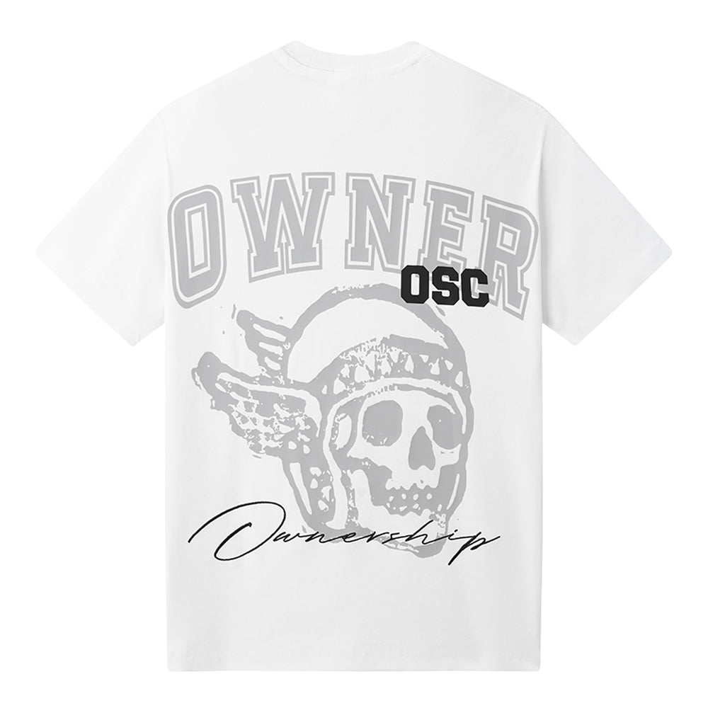 Elevate your streetwear with the Ownership Winged Skull Graphic Tee. This premium white short sleeve t-shirt features a minimalist Ownership script logo on the front chest, while the back boasts a bold, oversized "OWNER" graphic with a winged skull illustration, the “OSC” emblem, and Ownership cursive for added edge. Crafted from soft cotton for all-day comfort and effortless layering.