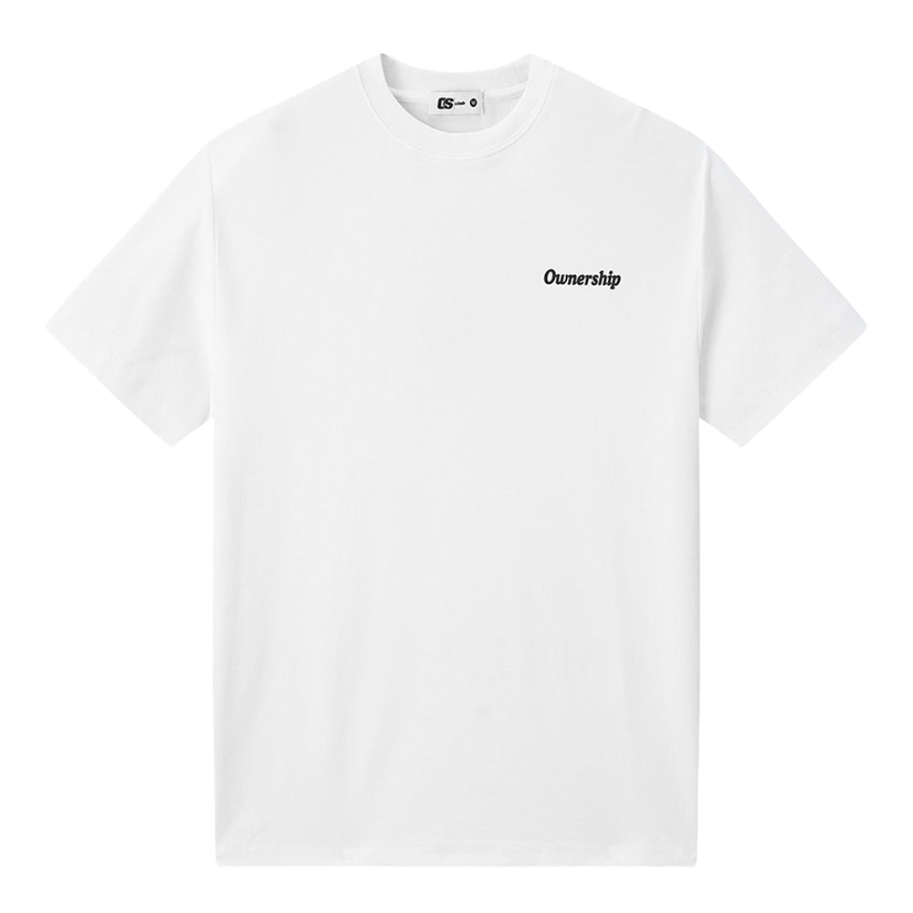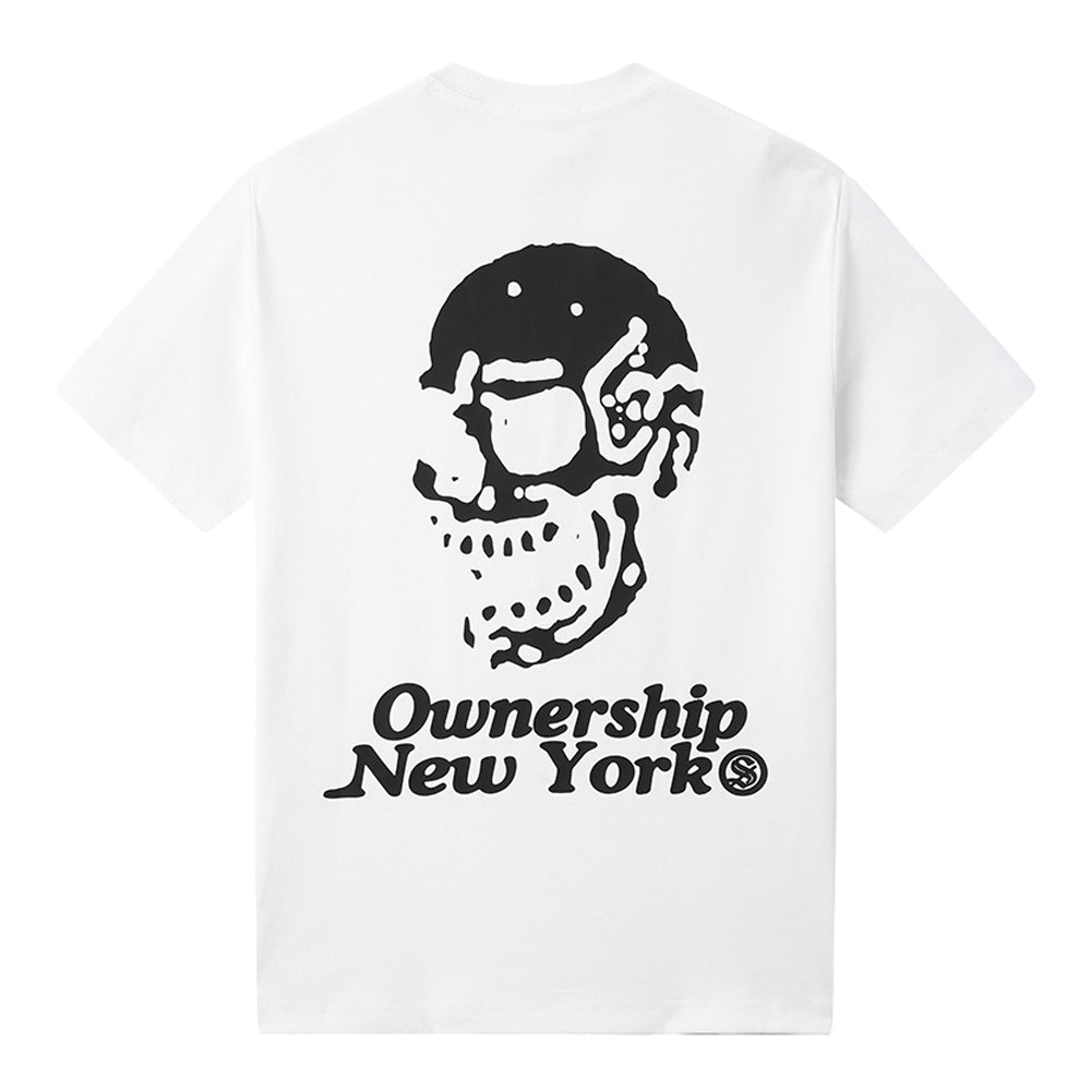 Turn heads with the crisp and bold Ownership NY Skull Tee in white. Featuring a subtle black “Ownership” logo on the front and a large, high-impact black skull illustration with “Ownership New York” branding on the back.