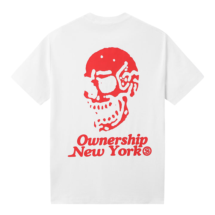 The Ownership NY Skull Tee in white and red brings bold graphic design to everyday wear. Featuring a sharp red “Ownership” logo on the chest and a powerful, full-back red skull graphic.