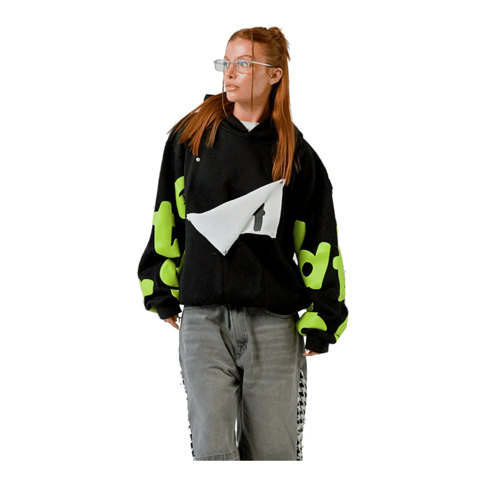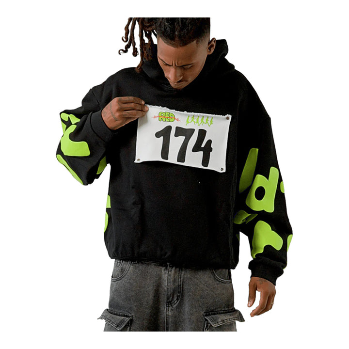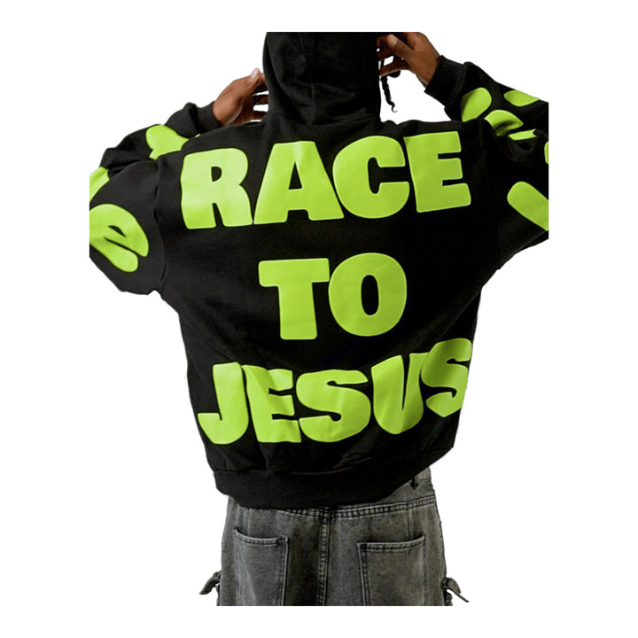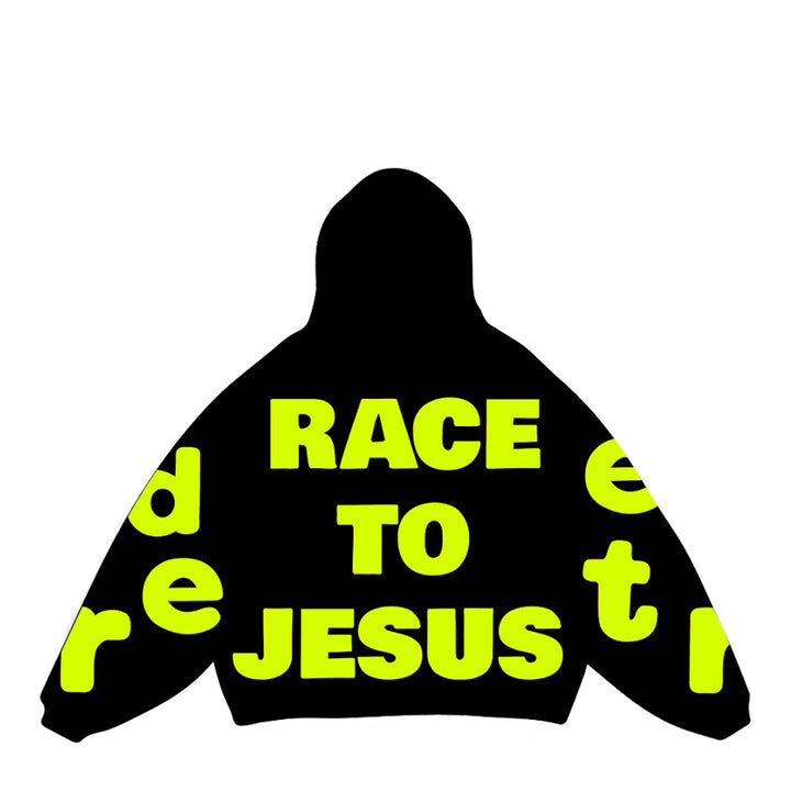 Stand out in faith and fashion with the "Race to Jesus" Scattered Hoodie. Featuring bold neon yellow lettering across the arms and back, this black hoodie carries a powerful message with style.