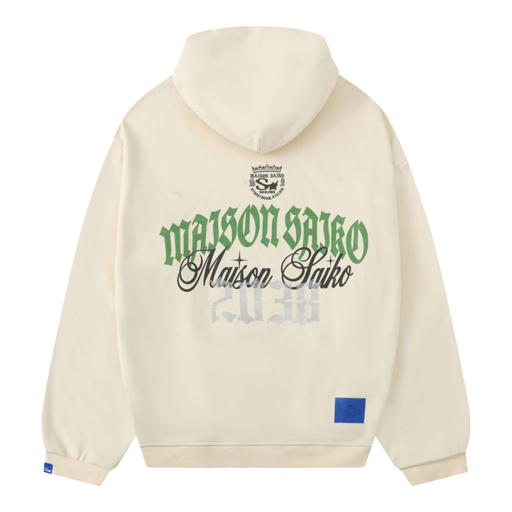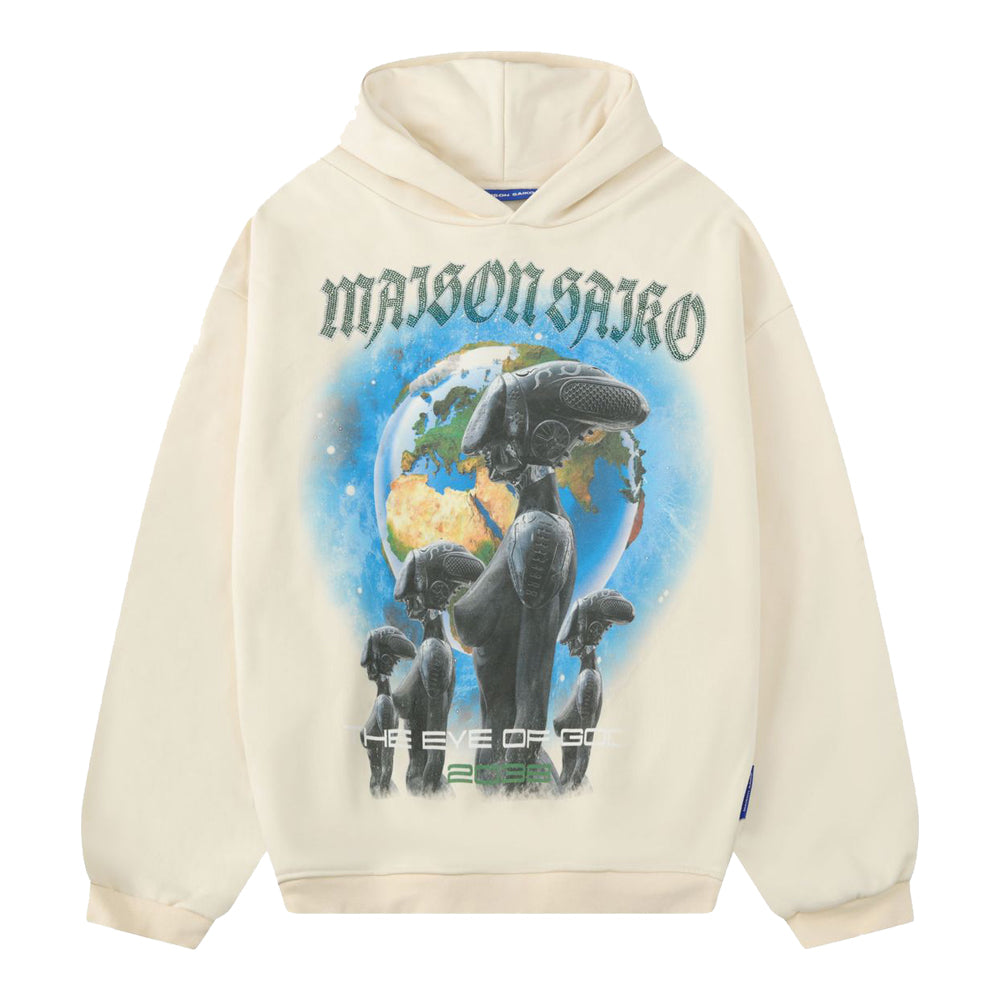 Make a cosmic statement with the Maison Saiko “Eye of God 2038” Hoodie. The front features a surreal sci-fi graphic of robotic statues surrounding a glowing Earth.