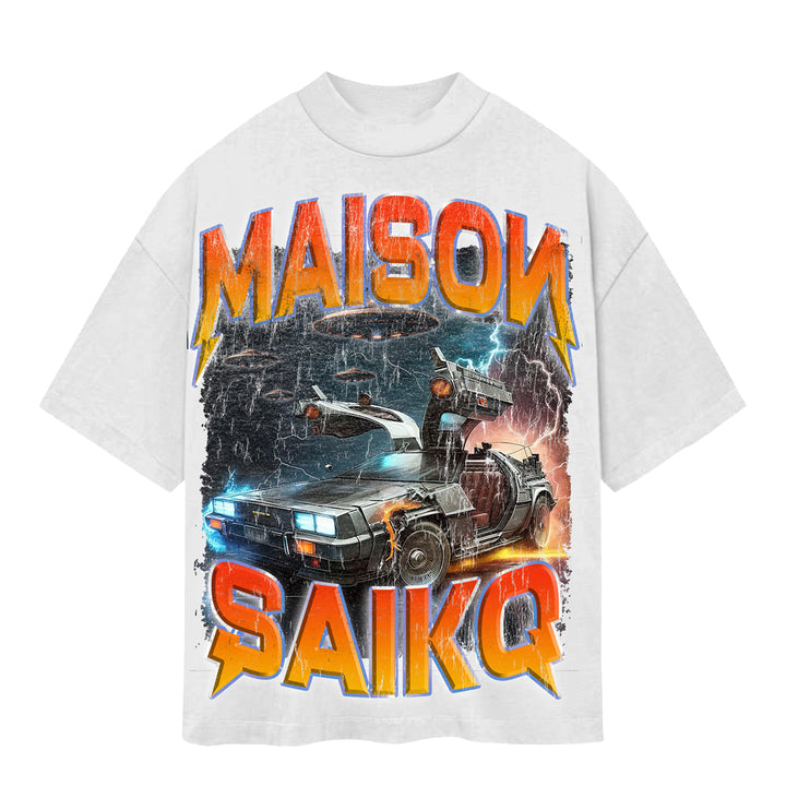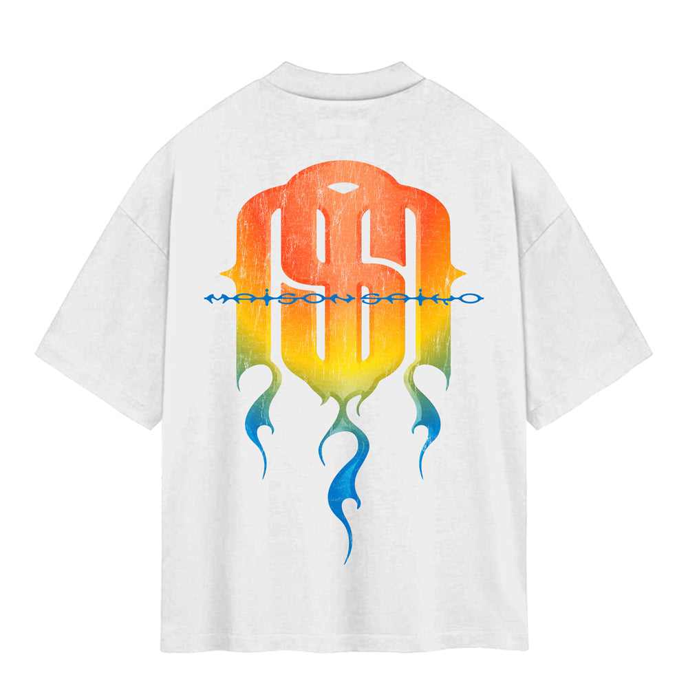 Step into the future with retro power in the Maison Saiko  Lost In The Future Tee. The front features a massive gradient MS flame logo in red, yellow, and blue Flame-dripped Maison Saiko logo on front