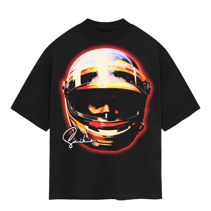 Stand out with this bold black t-shirt featuring a vibrant, high-contrast graphic of a racing helmet on the front, accented by a glowing red outline and signature-style text.