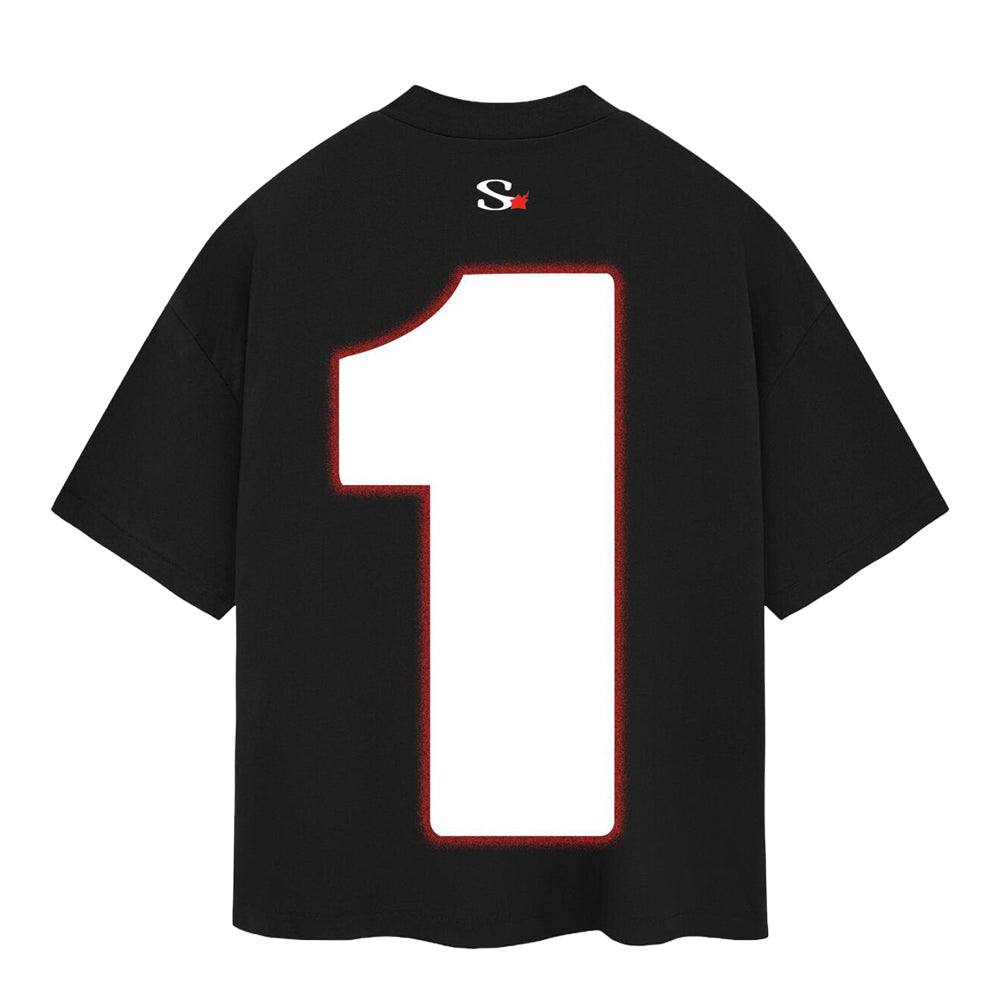 The back showcases a large white number "1" with a subtle red aura and a small “S” logo topped with a red maple leaf at the neck. Made from soft cotton and cut in an oversized fit, it’s a streetwear essential that merges speed and style.