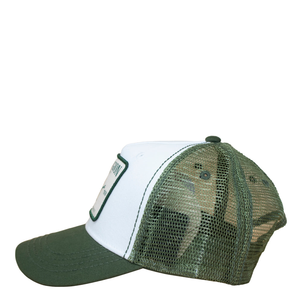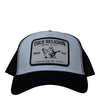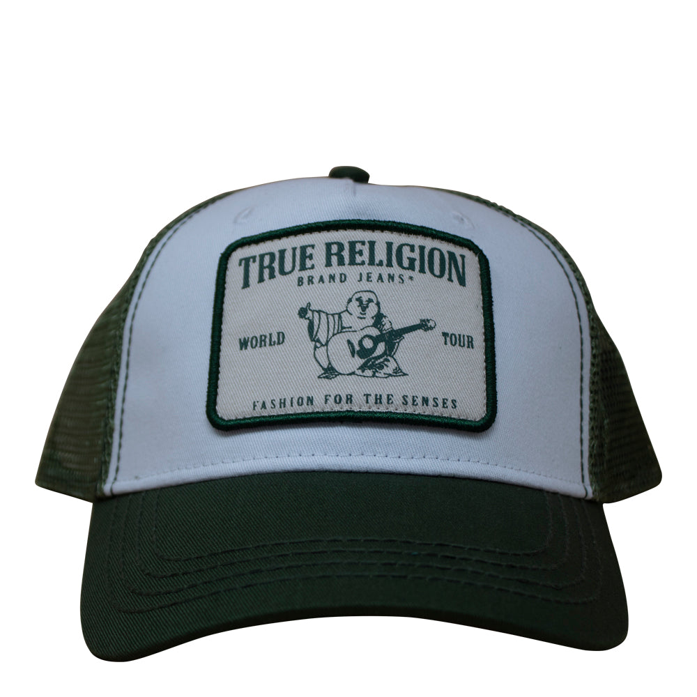 Elevate your casual style with the True Religion Buddha Ticket Trucker Hat. Featuring a white front panel with a bold Buddha concert ticket patch graphic, this hat blends vintage flair with modern streetwear appeal. The green curved brim and breathable green mesh back offer comfort and classic trucker styling. Finished with an adjustable snapback closure for a custom fit.