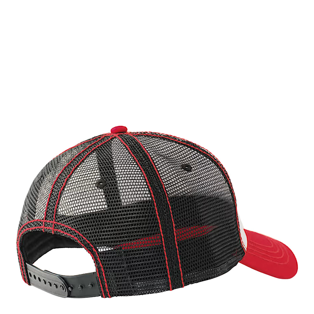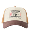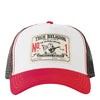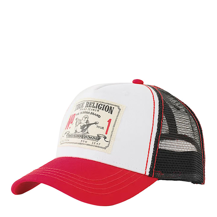 Elevate your casual style with the True Religion Buddha Ticket Trucker Hat. Featuring a white front panel with a bold Buddha concert ticket patch graphic, this hat blends vintage flair with modern streetwear appeal. The Red curved brim and breathable black mesh back offer comfort and classic trucker styling. Finished with an adjustable snapback closure for a custom fit.