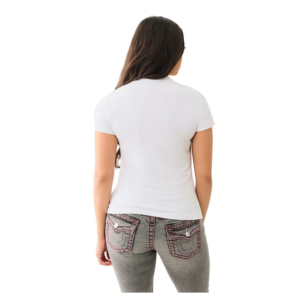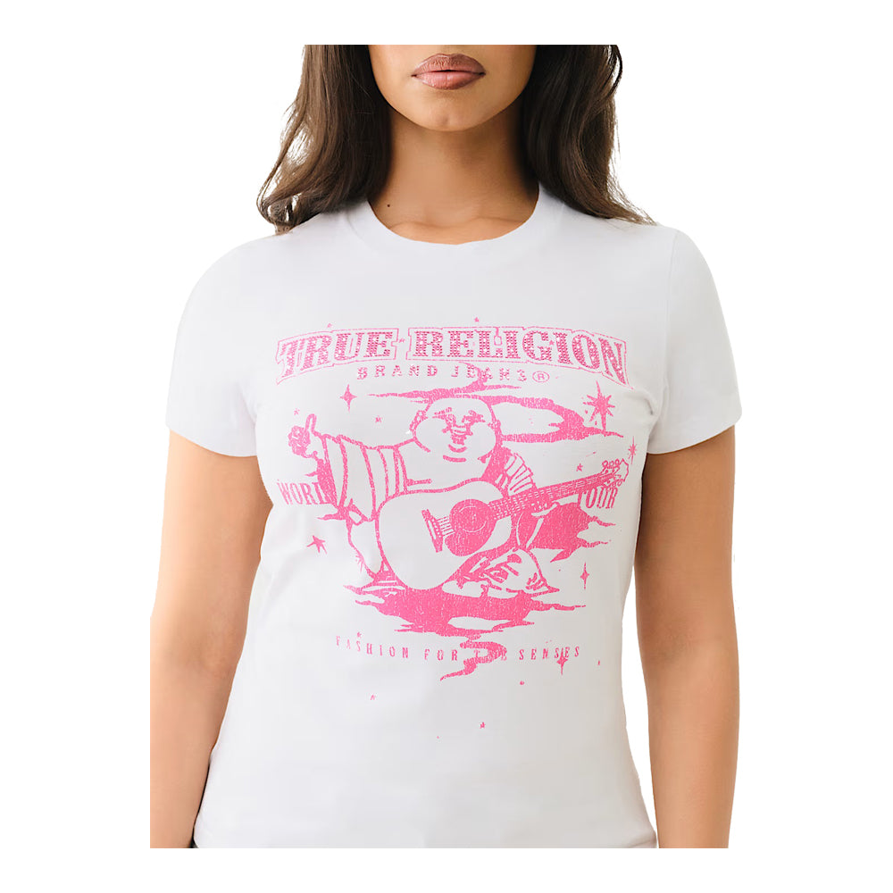 Add some bling to your basics with the Crystal Logo Buddha Tee. Crafted from a cotton blend, this T-shirt features a crew neck and short sleeves. Complete with a crystal True Religion logo and Buddha print graphic.