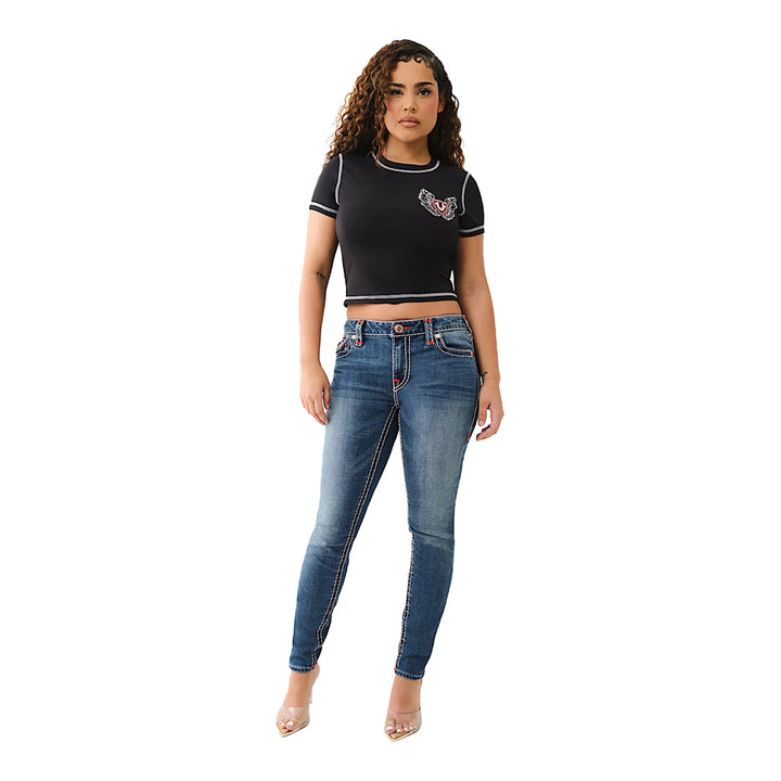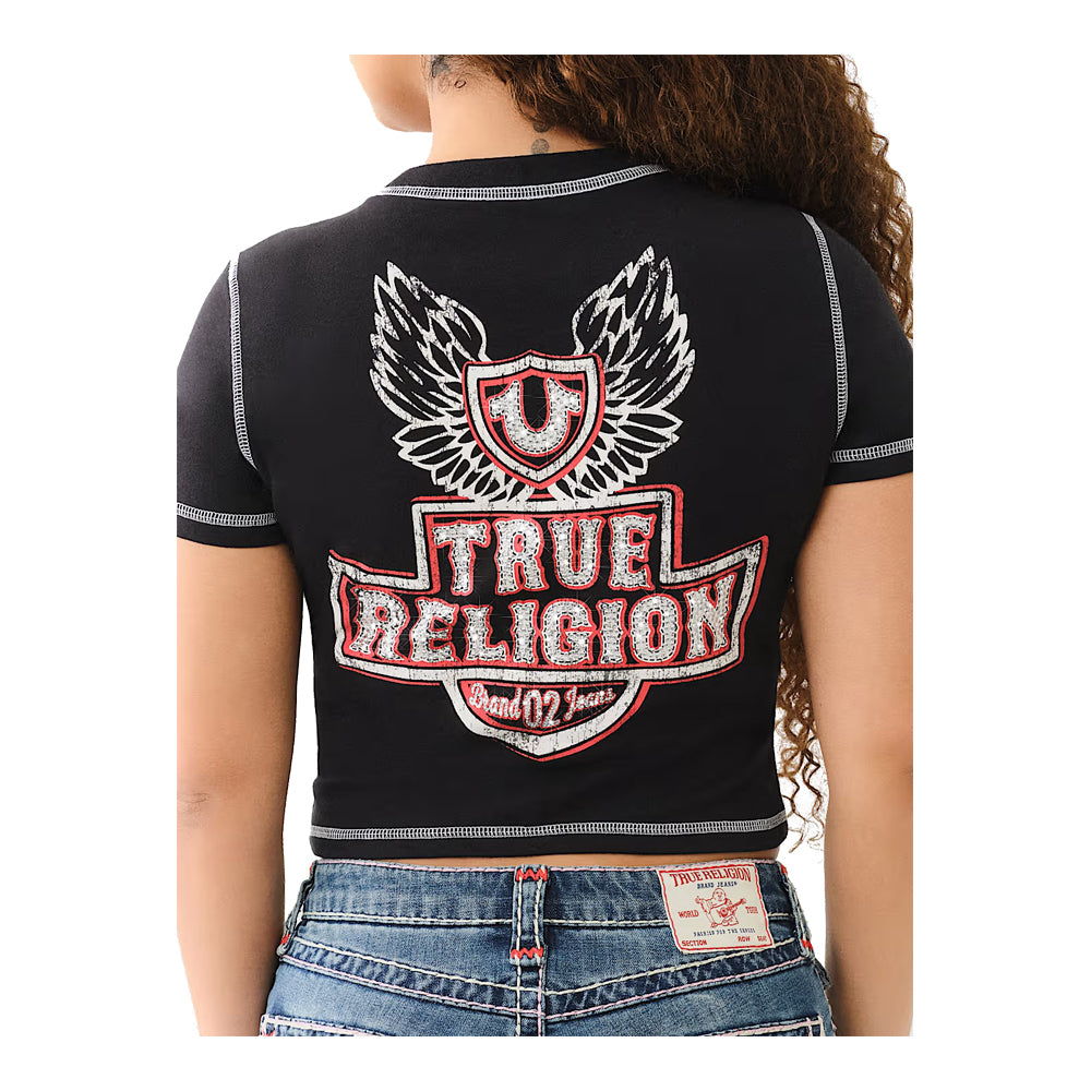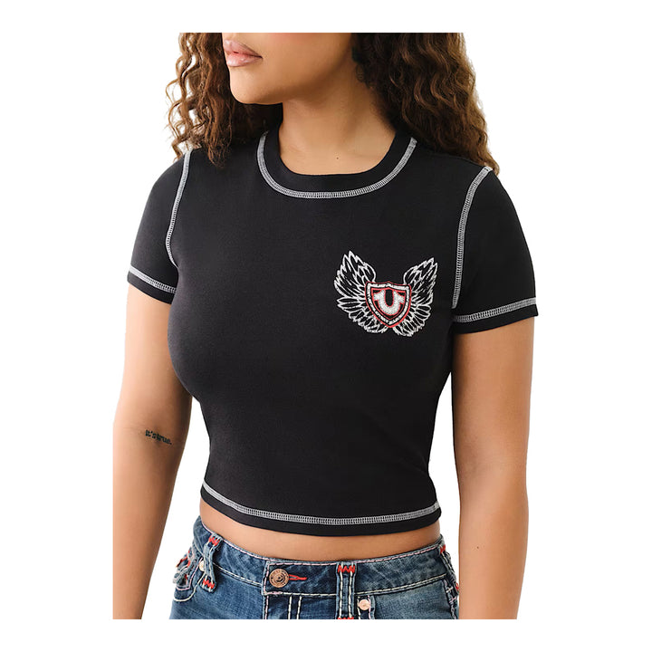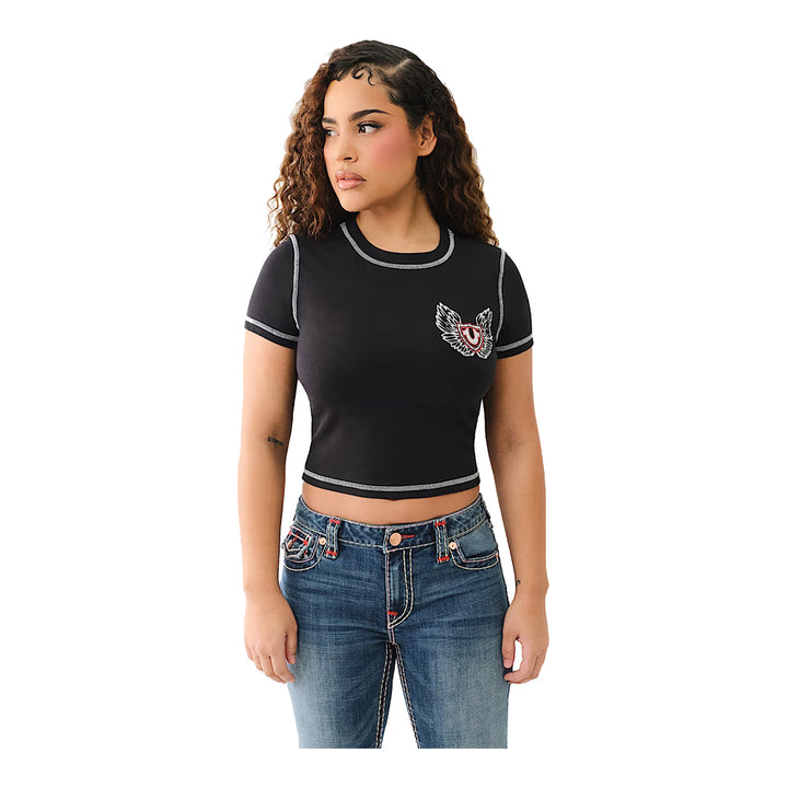 True Religion Women's Flatlock Winged Crystal Logo Baby Tee - Black