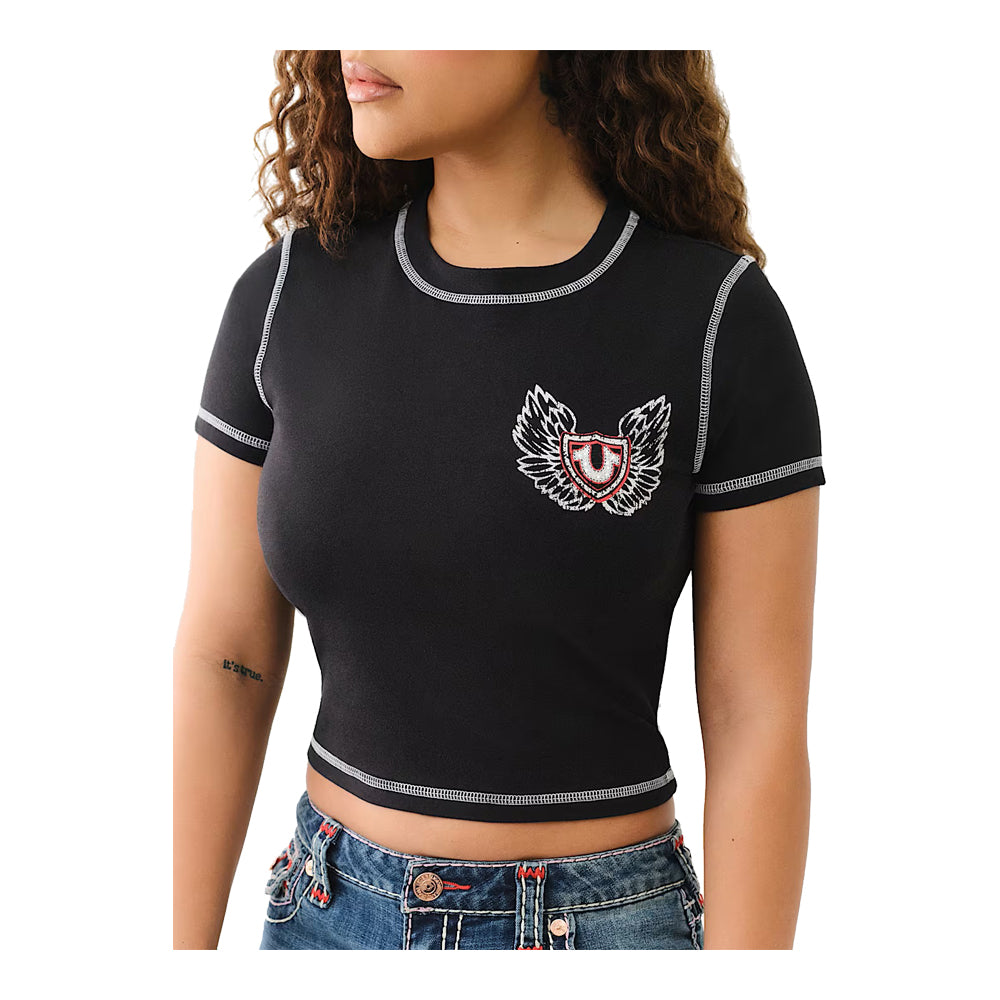 True Religion Women's Flatlock Winged Crystal Logo Baby Tee - Black 1